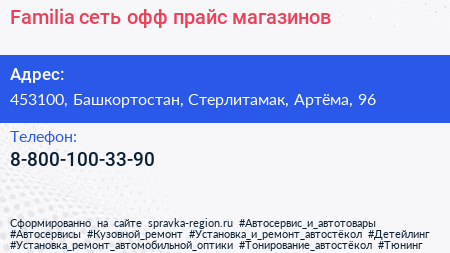 Familia, сеть офф-прайс магазинов по адресу 453100, Башкортостан, Стерлитамак, Артёма, 96 в дальнейшем Организация, размещена в следующих категориях:
