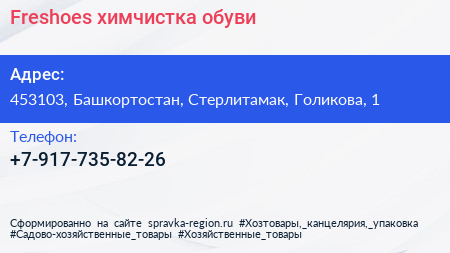 Freshoes, химчистка обуви по адресу 453103, Башкортостан, Стерлитамак, Голикова, 1 в дальнейшем Организация, размещена в следующих категориях:
