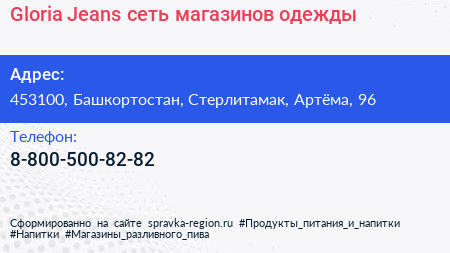 Gloria Jeans, сеть магазинов одежды по адресу 453100, Башкортостан, Стерлитамак, Артёма, 96 в дальнейшем Организация, размещена в следующих категориях: