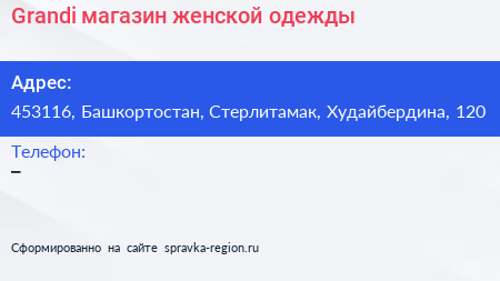 Grandi, магазин женской одежды по адресу 453116, Башкортостан, Стерлитамак, Худайбердина, 120 в дальнейшем Организация, размещена в следующих категориях: