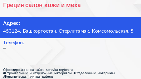 Греция, салон кожи и меха по адресу 453124, Башкортостан, Стерлитамак, Комсомольская, 5 в дальнейшем Организация, размещена в следующих категориях: