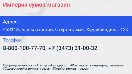 Империя сумок, магазин по адресу 453116, Башкортостан, Стерлитамак, Худайбердина, 120 в дальнейшем Организация, размещена в следующих категориях: