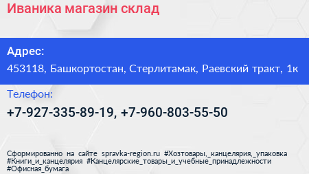 Иваника, магазин-склад по адресу 453118, Башкортостан, Стерлитамак, Раевский тракт, 1к в дальнейшем Организация, размещена в следующих категориях: