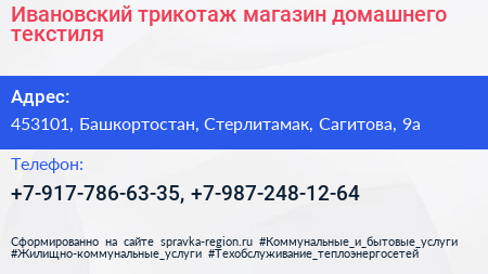 Ивановский трикотаж, магазин домашнего текстиля по адресу 453101, Башкортостан, Стерлитамак, Сагитова, 9а в дальнейшем Организация, размещена в следующих категориях: