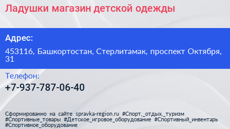 Ладушки, магазин детской одежды по адресу 453116, Башкортостан, Стерлитамак, проспект Октября, 31 в дальнейшем Организация, размещена в следующих категориях: