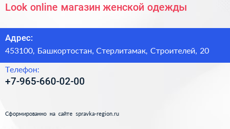 Look online, магазин женской одежды по адресу 453100, Башкортостан, Стерлитамак, Строителей, 20 в дальнейшем Организация, размещена в следующих категориях: