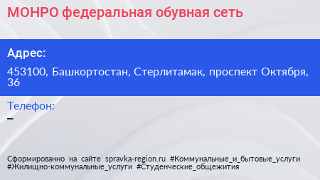 МОНРО, федеральная обувная сеть по адресу 453100, Башкортостан, Стерлитамак, проспект Октября, 36 в дальнейшем Организация, размещена в следующих категориях: