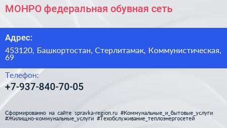 МОНРО, федеральная обувная сеть по адресу 453120, Башкортостан, Стерлитамак, Коммунистическая, 69 в дальнейшем Организация, размещена в следующих категориях: