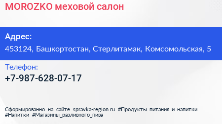 MOROZKO, меховой салон по адресу 453124, Башкортостан, Стерлитамак, Комсомольская, 5 в дальнейшем Организация, размещена в следующих категориях: