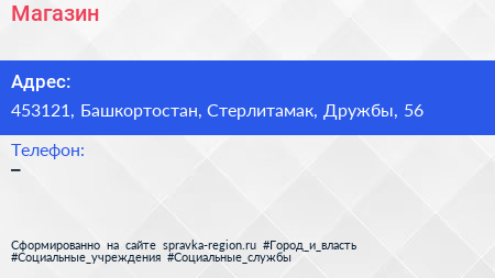 Магазин по адресу 453121, Башкортостан, Стерлитамак, Дружбы, 56 в дальнейшем Организация, размещена в следующих категориях: