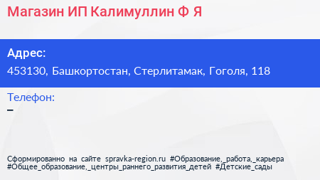 Магазин, ИП Калимуллин Ф.Я. по адресу 453130, Башкортостан, Стерлитамак, Гоголя, 118 в дальнейшем Организация, размещена в следующих категориях: