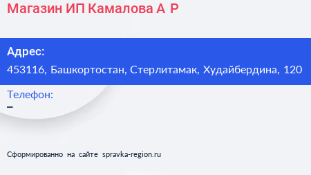 Магазин, ИП Камалова А.Р. по адресу 453116, Башкортостан, Стерлитамак, Худайбердина, 120 в дальнейшем Организация, размещена в следующих категориях: