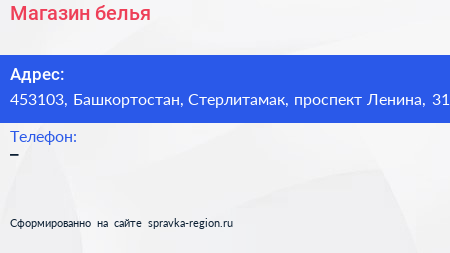 Магазин белья по адресу 453103, Башкортостан, Стерлитамак, проспект Ленина, 31 в дальнейшем Организация, размещена в следующих категориях: