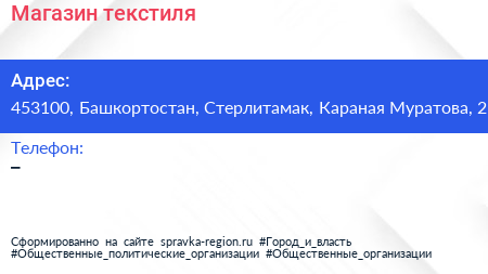 Магазин текстиля по адресу 453100, Башкортостан, Стерлитамак, Караная Муратова, 2 в дальнейшем Организация, размещена в следующих категориях: