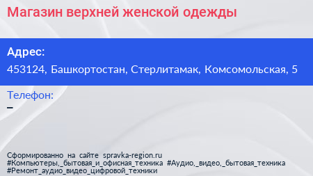 Магазин верхней женской одежды по адресу 453124, Башкортостан, Стерлитамак, Комсомольская, 5 в дальнейшем Организация, размещена в следующих категориях: