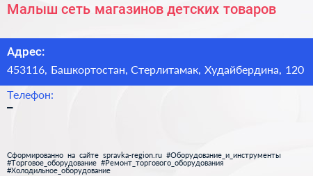 Малыш, сеть магазинов детских товаров по адресу 453116, Башкортостан, Стерлитамак, Худайбердина, 120 в дальнейшем Организация, размещена в следующих категориях: