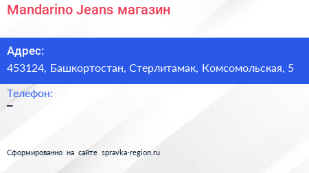 Mandarino-Jeans, магазин по адресу 453124, Башкортостан, Стерлитамак, Комсомольская, 5 в дальнейшем Организация, размещена в следующих категориях: