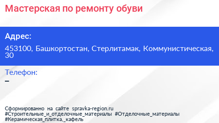 Мастерская по ремонту обуви по адресу 453100, Башкортостан, Стерлитамак, Коммунистическая, 30 в дальнейшем Организация, размещена в следующих категориях: