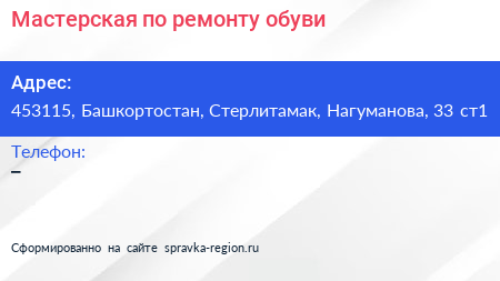Мастерская по ремонту обуви по адресу 453115, Башкортостан, Стерлитамак, Нагуманова, 33 ст1 в дальнейшем Организация, размещена в следующих категориях: