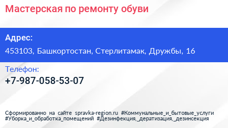 Мастерская по ремонту обуви по адресу 453103, Башкортостан, Стерлитамак, Дружбы, 16 в дальнейшем Организация, размещена в следующих категориях: