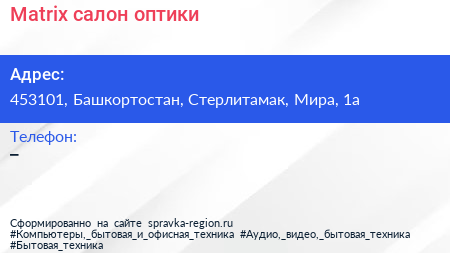 Matrix, салон оптики по адресу 453101, Башкортостан, Стерлитамак, Мира, 1а в дальнейшем Организация, размещена в следующих категориях: