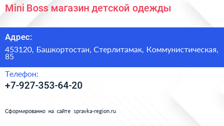 Mini Boss, магазин детской одежды по адресу 453120, Башкортостан, Стерлитамак, Коммунистическая, 85 в дальнейшем Организация, размещена в следующих категориях: