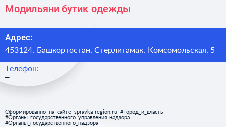 Модильяни, бутик одежды по адресу 453124, Башкортостан, Стерлитамак, Комсомольская, 5 в дальнейшем Организация, размещена в следующих категориях: