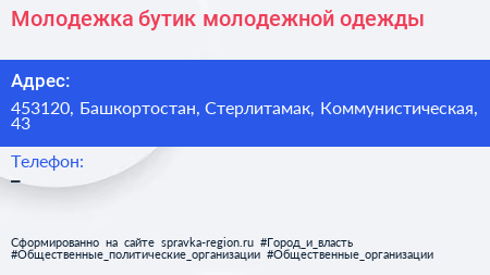 Молодежка, бутик молодежной одежды по адресу 453120, Башкортостан, Стерлитамак, Коммунистическая, 43 в дальнейшем Организация, размещена в следующих категориях: