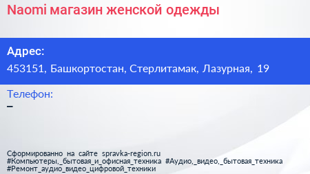 Naomi, магазин женской одежды по адресу 453151, Башкортостан, Стерлитамак, Лазурная, 19 в дальнейшем Организация, размещена в следующих категориях: