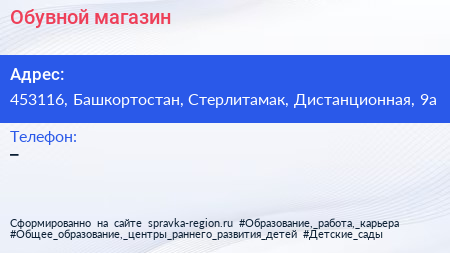 Обувной магазин по адресу 453116, Башкортостан, Стерлитамак, Дистанционная, 9а в дальнейшем Организация, размещена в следующих категориях: