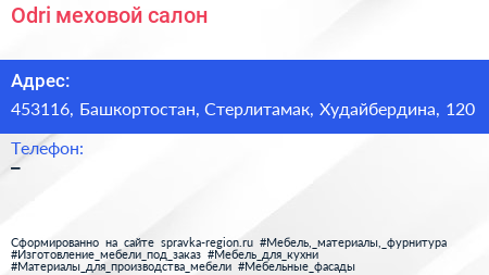 Odri, меховой салон по адресу 453116, Башкортостан, Стерлитамак, Худайбердина, 120 в дальнейшем Организация, размещена в следующих категориях: