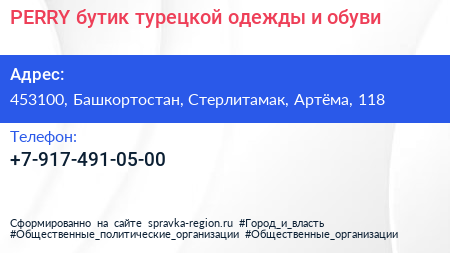 PERRY, бутик турецкой одежды и обуви по адресу 453100, Башкортостан, Стерлитамак, Артёма, 118 в дальнейшем Организация, размещена в следующих категориях: