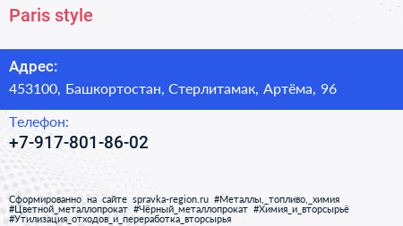 Paris style по адресу 453100, Башкортостан, Стерлитамак, Артёма, 96 в дальнейшем Организация, размещена в следующих категориях: