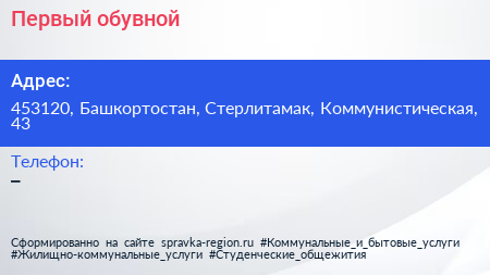 #Первый обувной по адресу 453120, Башкортостан, Стерлитамак, Коммунистическая, 43 в дальнейшем Организация, размещена в следующих категориях: