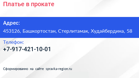 Платье в прокате по адресу 453126, Башкортостан, Стерлитамак, Худайбердина, 58 в дальнейшем Организация, размещена в следующих категориях: