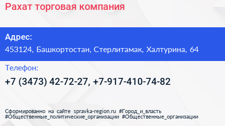 Рахат, торговая компания по адресу 453124, Башкортостан, Стерлитамак, Халтурина, 64 в дальнейшем Организация, размещена в следующих категориях: