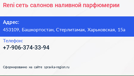 Reni, сеть салонов наливной парфюмерии по адресу 453109, Башкортостан, Стерлитамак, Харьковская, 15а в дальнейшем Организация, размещена в следующих категориях: