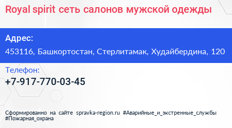 Royal spirit, сеть салонов мужской одежды по адресу 453116, Башкортостан, Стерлитамак, Худайбердина, 120 в дальнейшем Организация, размещена в следующих категориях: