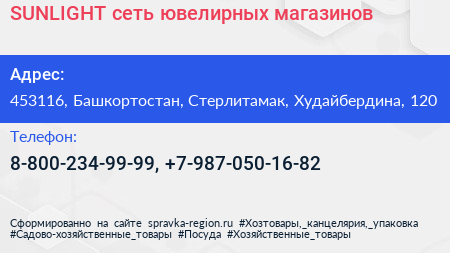 SUNLIGHT, сеть ювелирных магазинов по адресу 453116, Башкортостан, Стерлитамак, Худайбердина, 120 в дальнейшем Организация, размещена в следующих категориях: