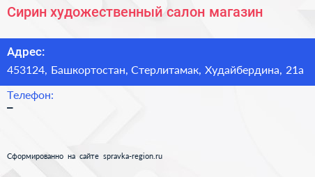 Сирин, художественный салон-магазин по адресу 453124, Башкортостан, Стерлитамак, Худайбердина, 21а в дальнейшем Организация, размещена в следующих категориях:
