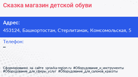 Сказка, магазин детской обуви по адресу 453124, Башкортостан, Стерлитамак, Комсомольская, 5 в дальнейшем Организация, размещена в следующих категориях: