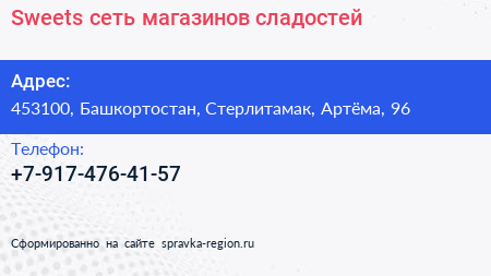 Sweets, сеть магазинов сладостей по адресу 453100, Башкортостан, Стерлитамак, Артёма, 96 в дальнейшем Организация, размещена в следующих категориях: