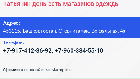 Татьянин день, сеть магазинов одежды по адресу 453115, Башкортостан, Стерлитамак, Вокзальная, 4а в дальнейшем Организация, размещена в следующих категориях: