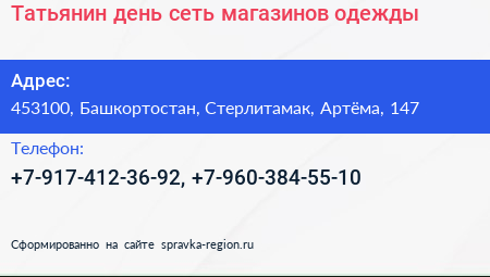 Татьянин день, сеть магазинов одежды по адресу 453100, Башкортостан, Стерлитамак, Артёма, 147 в дальнейшем Организация, размещена в следующих категориях: