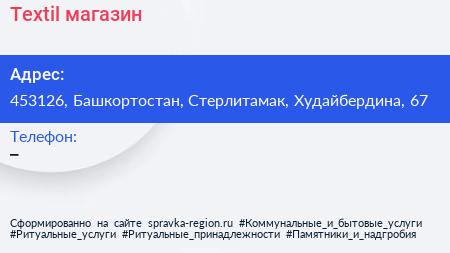 Textil, магазин по адресу 453126, Башкортостан, Стерлитамак, Худайбердина, 67 в дальнейшем Организация, размещена в следующих категориях: