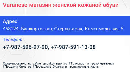 Varanese, магазин женской кожаной обуви по адресу 453124, Башкортостан, Стерлитамак, Комсомольская, 5 в дальнейшем Организация, размещена в следующих категориях: