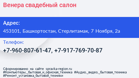 Венера, свадебный салон по адресу 453101, Башкортостан, Стерлитамак, 7 Ноября, 2а в дальнейшем Организация, размещена в следующих категориях: