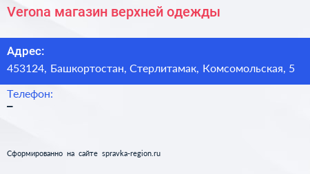 Verona, магазин верхней одежды по адресу 453124, Башкортостан, Стерлитамак, Комсомольская, 5 в дальнейшем Организация, размещена в следующих категориях: