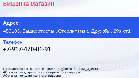 Вишенка, магазин по адресу 453103, Башкортостан, Стерлитамак, Дружбы, 29а ст1 в дальнейшем Организация, размещена в следующих категориях: