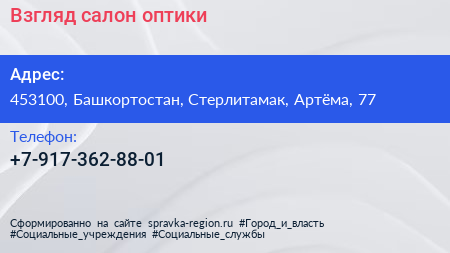 Взгляд, салон оптики по адресу 453100, Башкортостан, Стерлитамак, Артёма, 77 в дальнейшем Организация, размещена в следующих категориях: